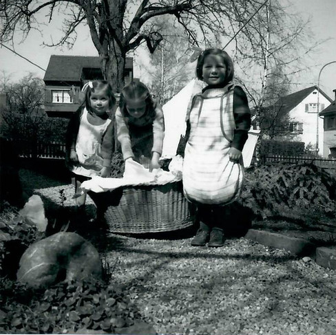Drei Schwestern im Garten an der Ecke zur Morgentalstrasse am Waschtag,